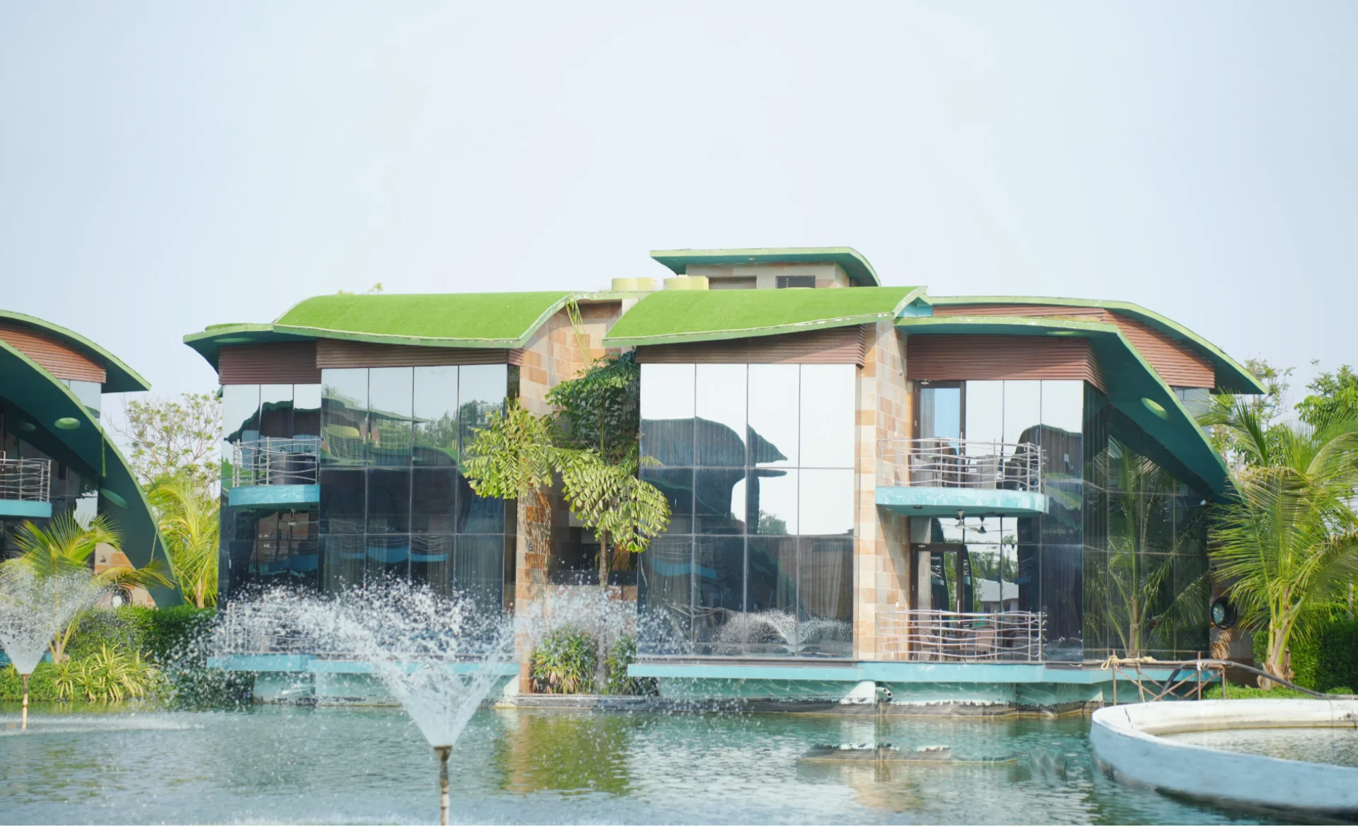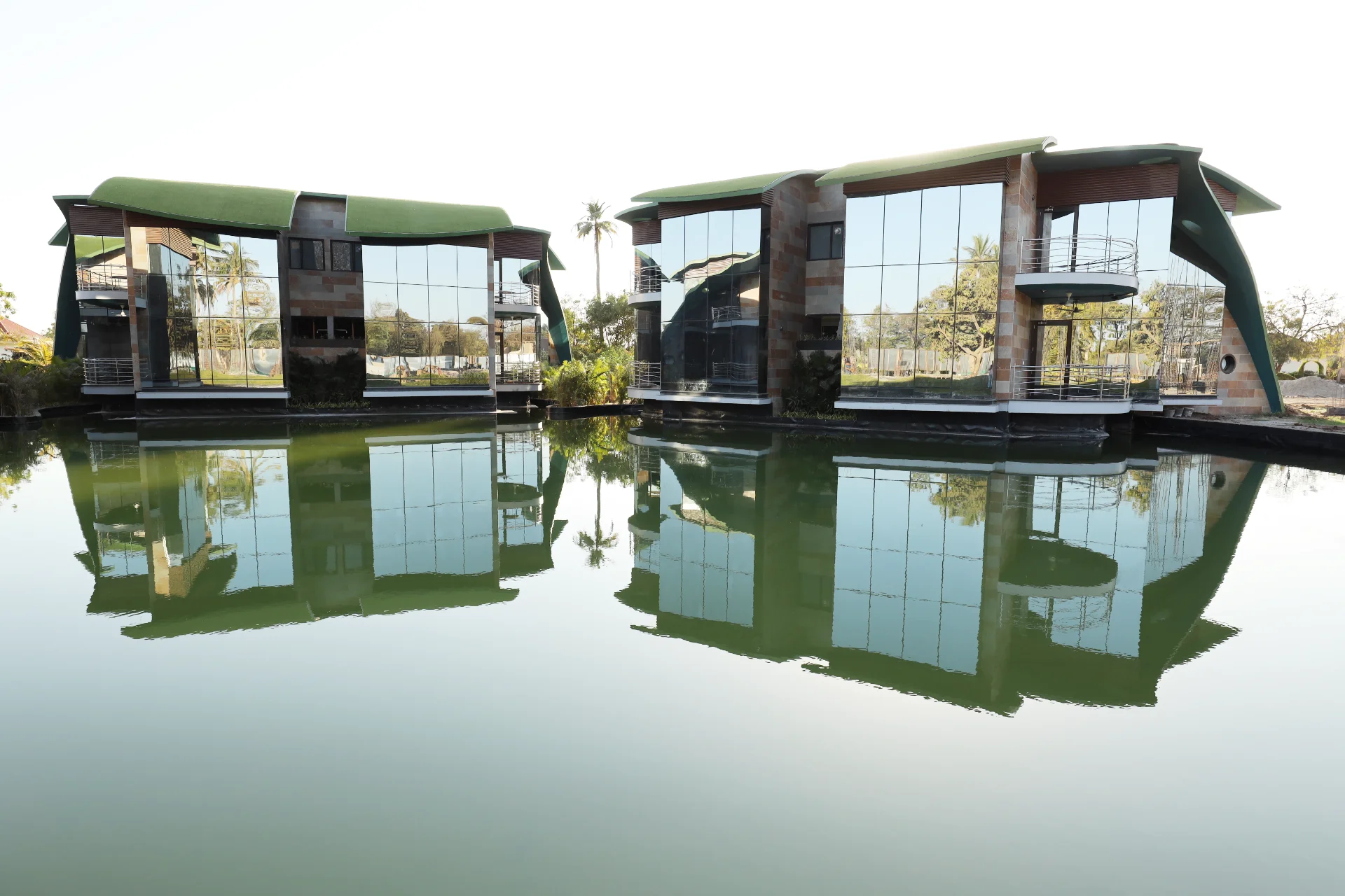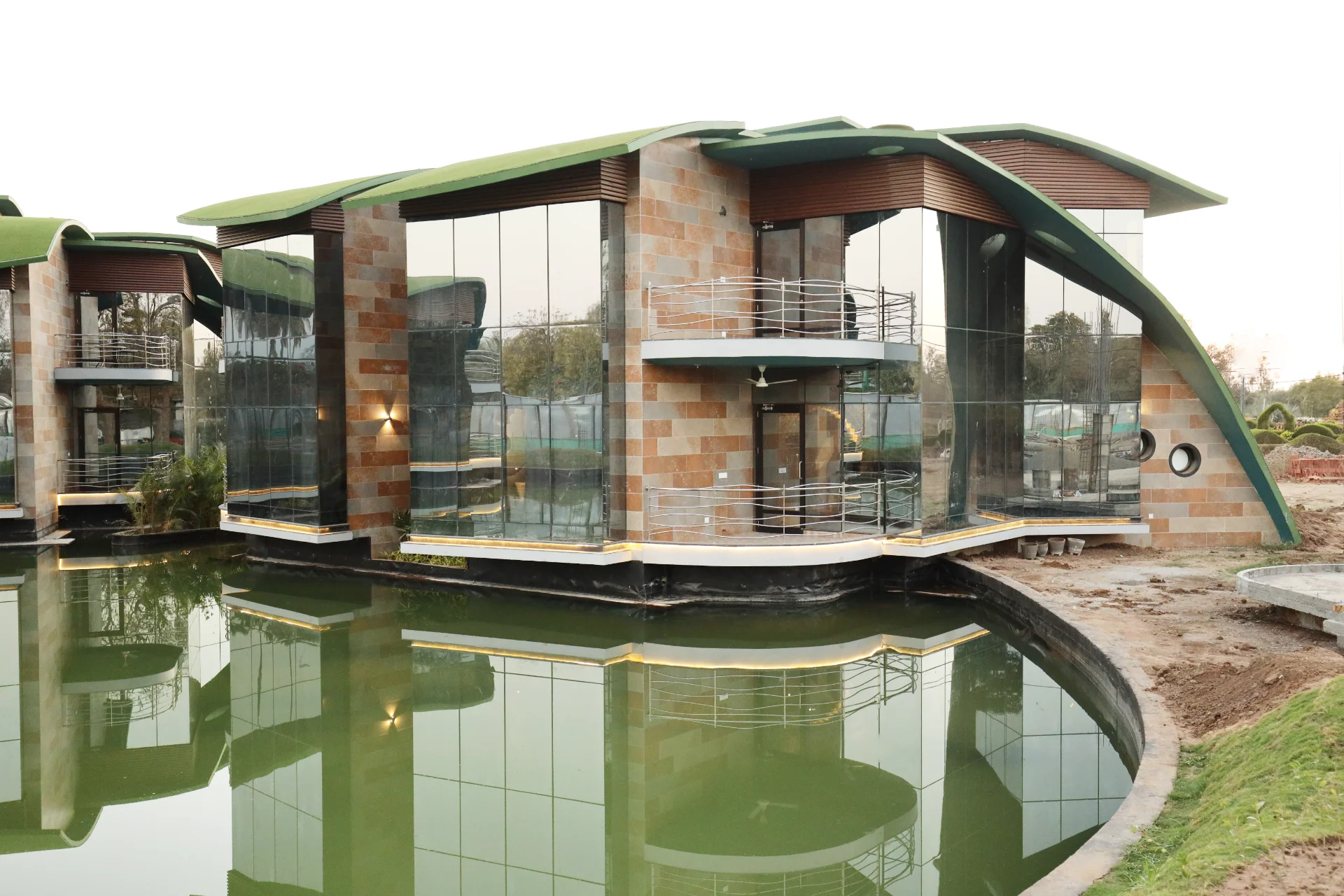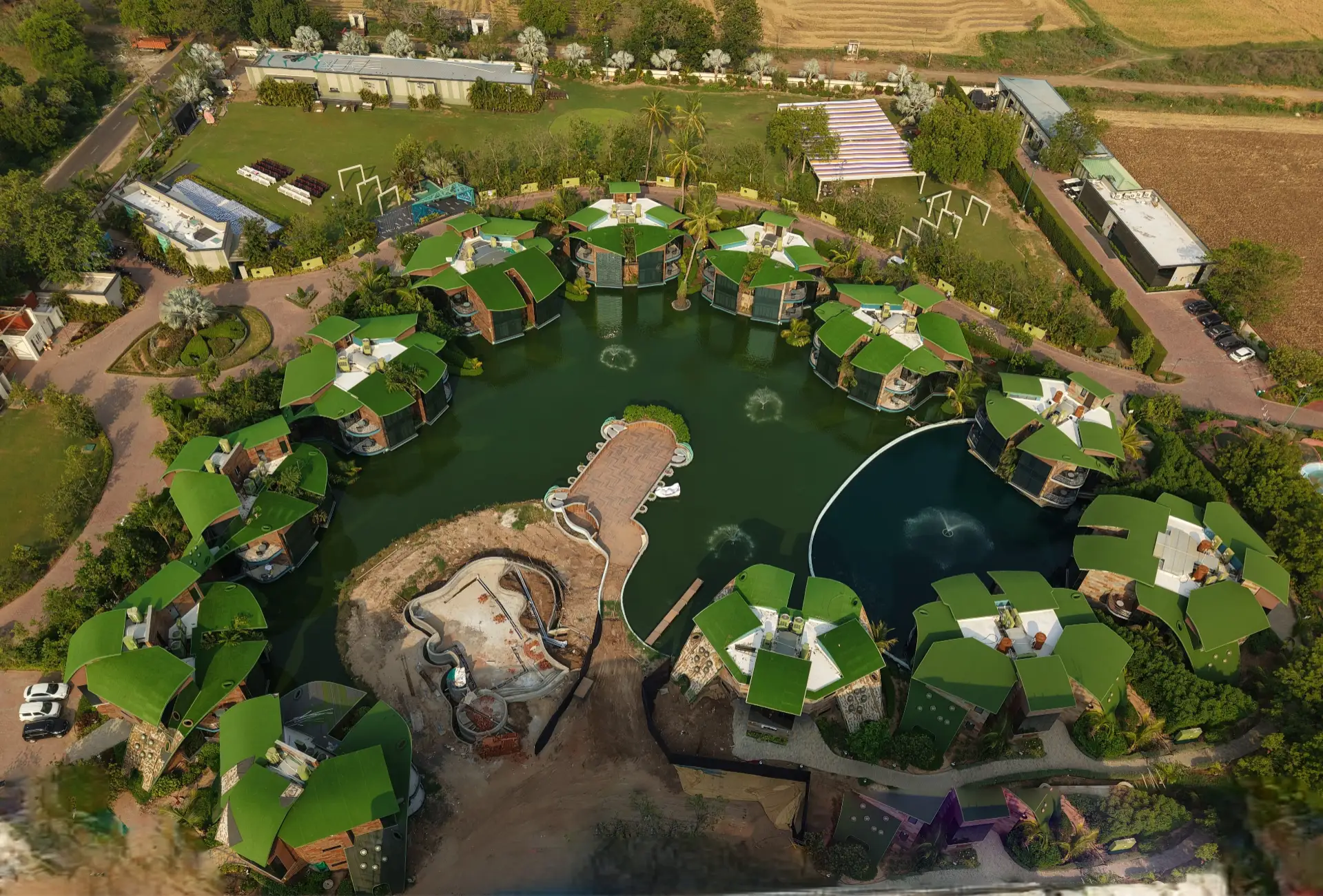 The project comprises 54 thematic water chalets, a luxury hotel building with 70 rooms, an expansive party lawn with well-appointed bridal suites, an impressive outdoor stage, a large banquet kitchen, a manmade lake with infinity pool, and a solar farm–cum–parking facility.