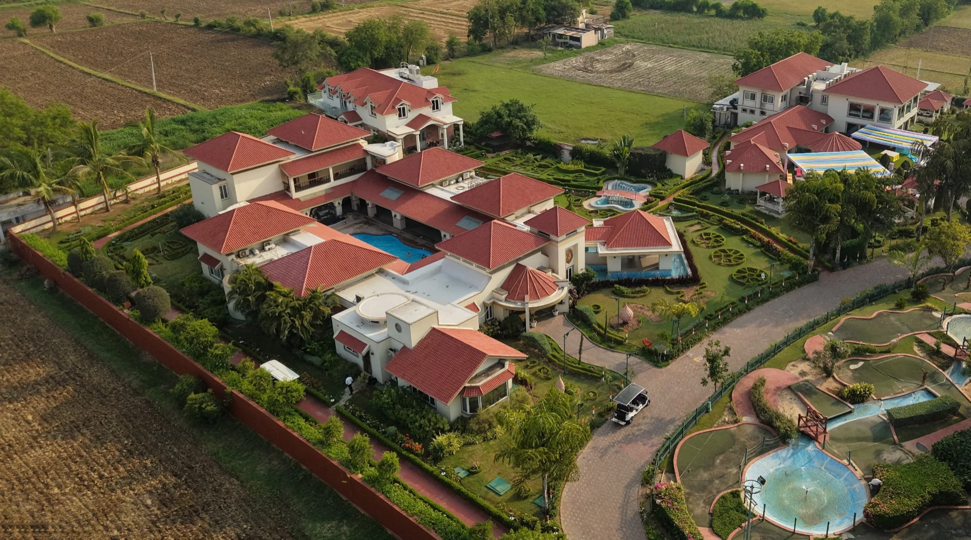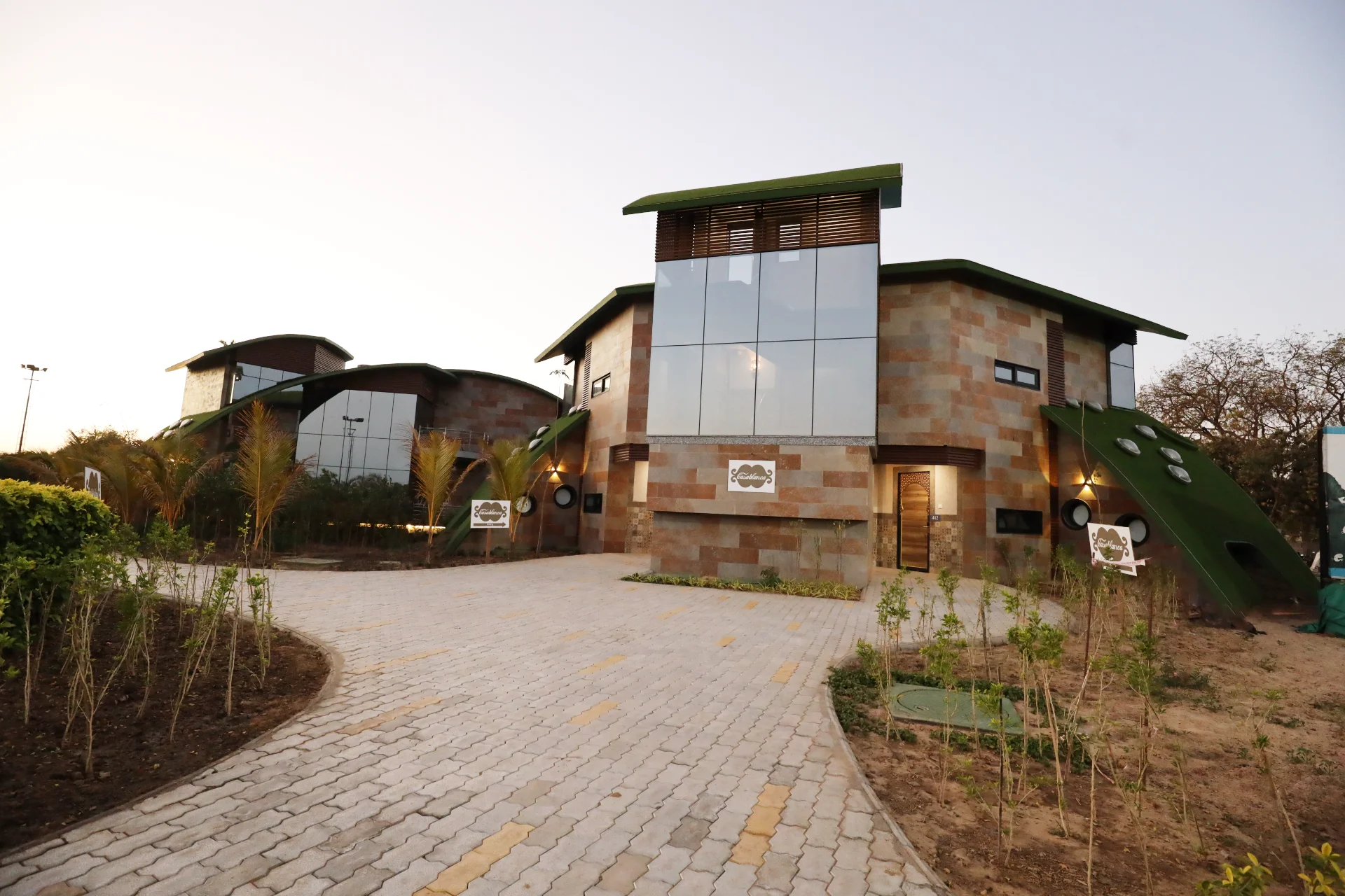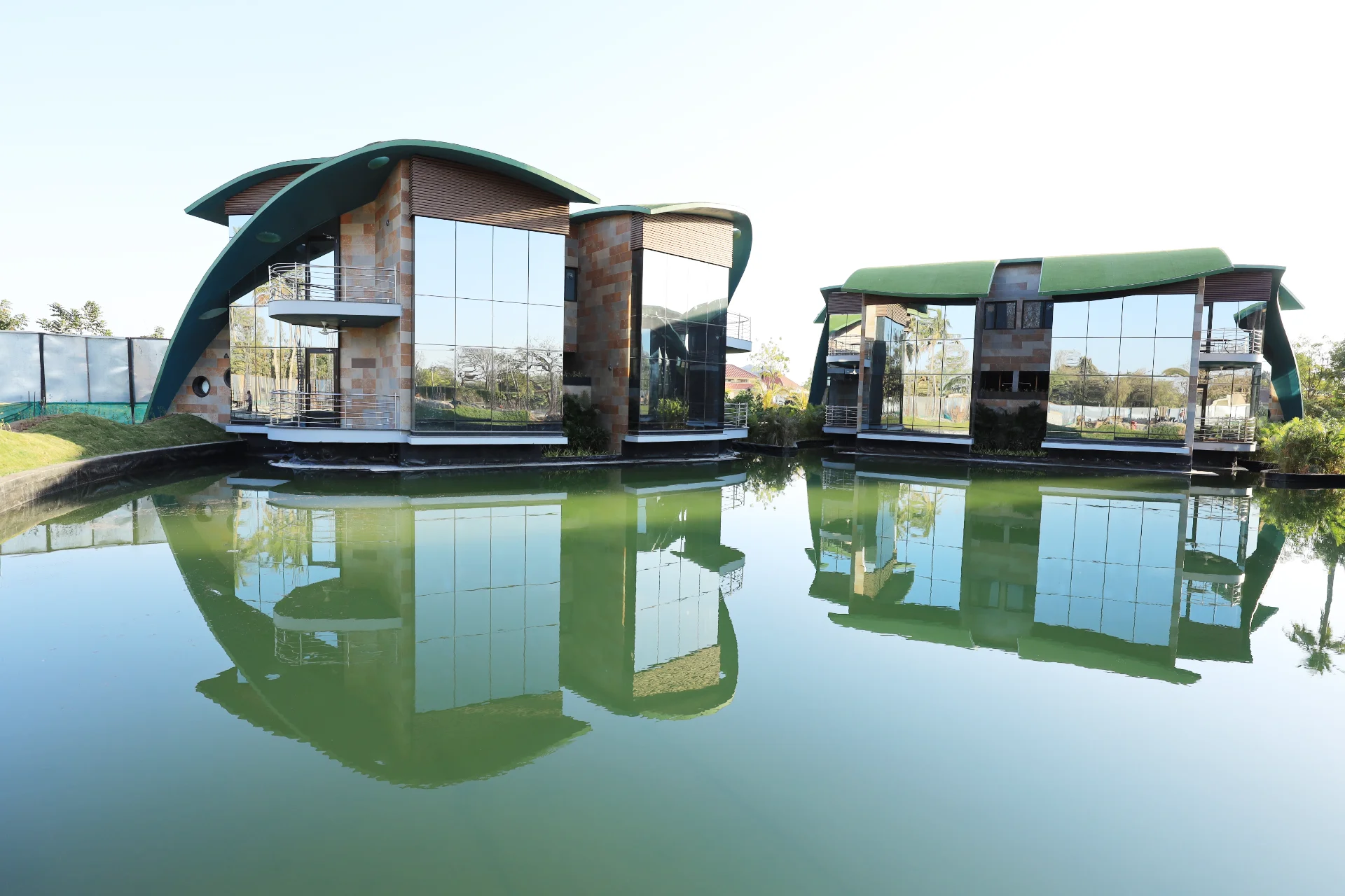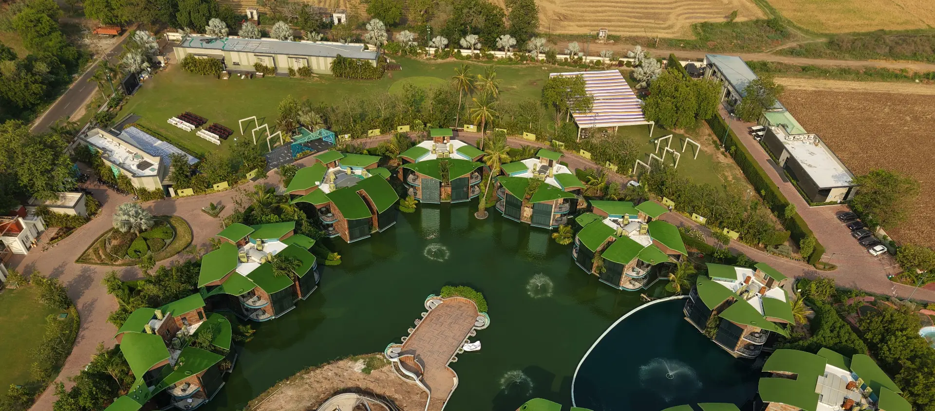The project comprises 54 thematic water chalets, a luxury hotel building with 70 rooms, an expansive party lawn with well-appointed bridal suites, an impressive outdoor stage, a large banquet kitchen, a manmade lake with infinity pool, and a solar farm–cum–parking facility.